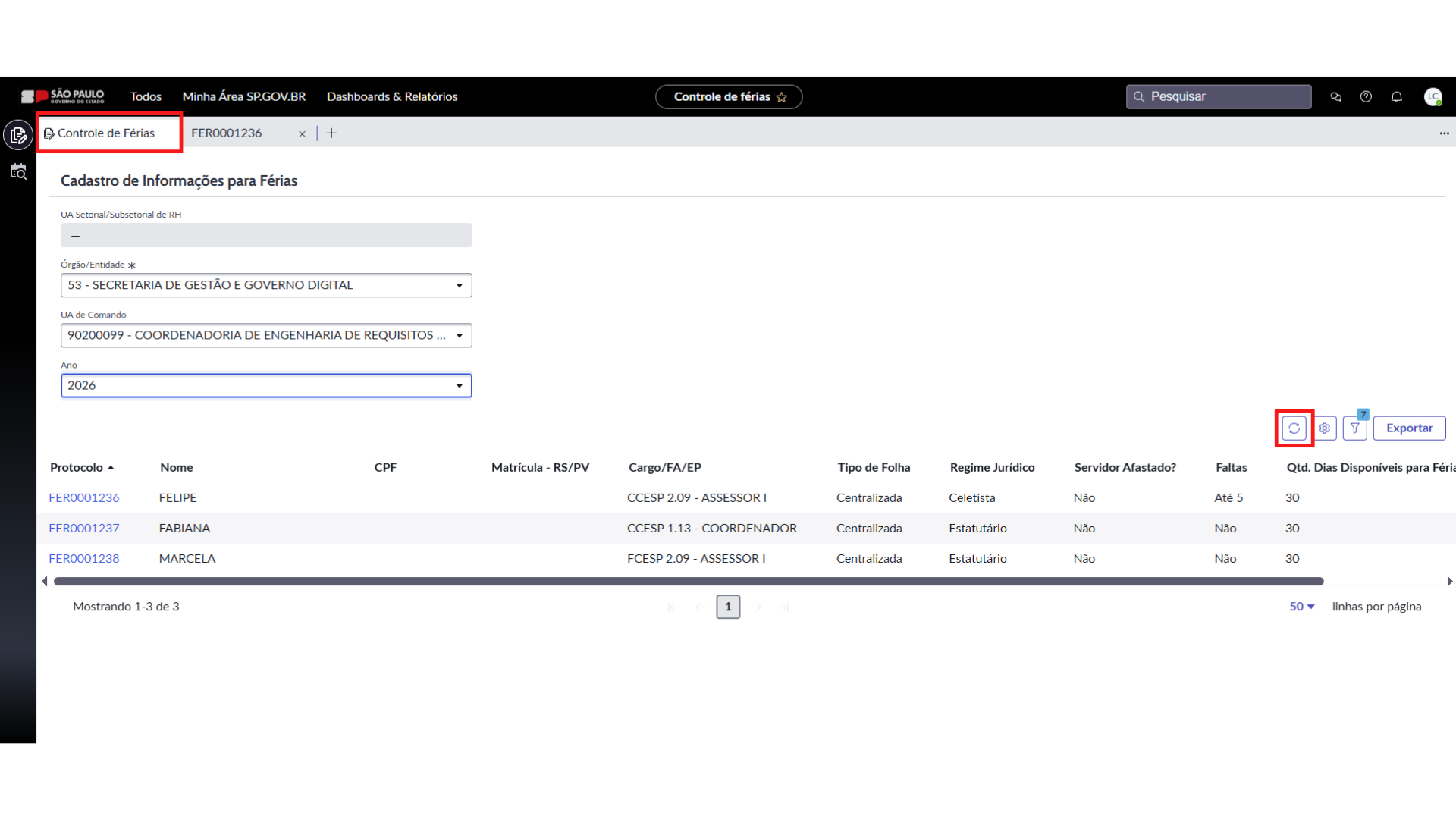 - Após efetuar a seleção o sistema abrirá uma lista com os dados dos servidores referentes a UA de Comando selecionada.