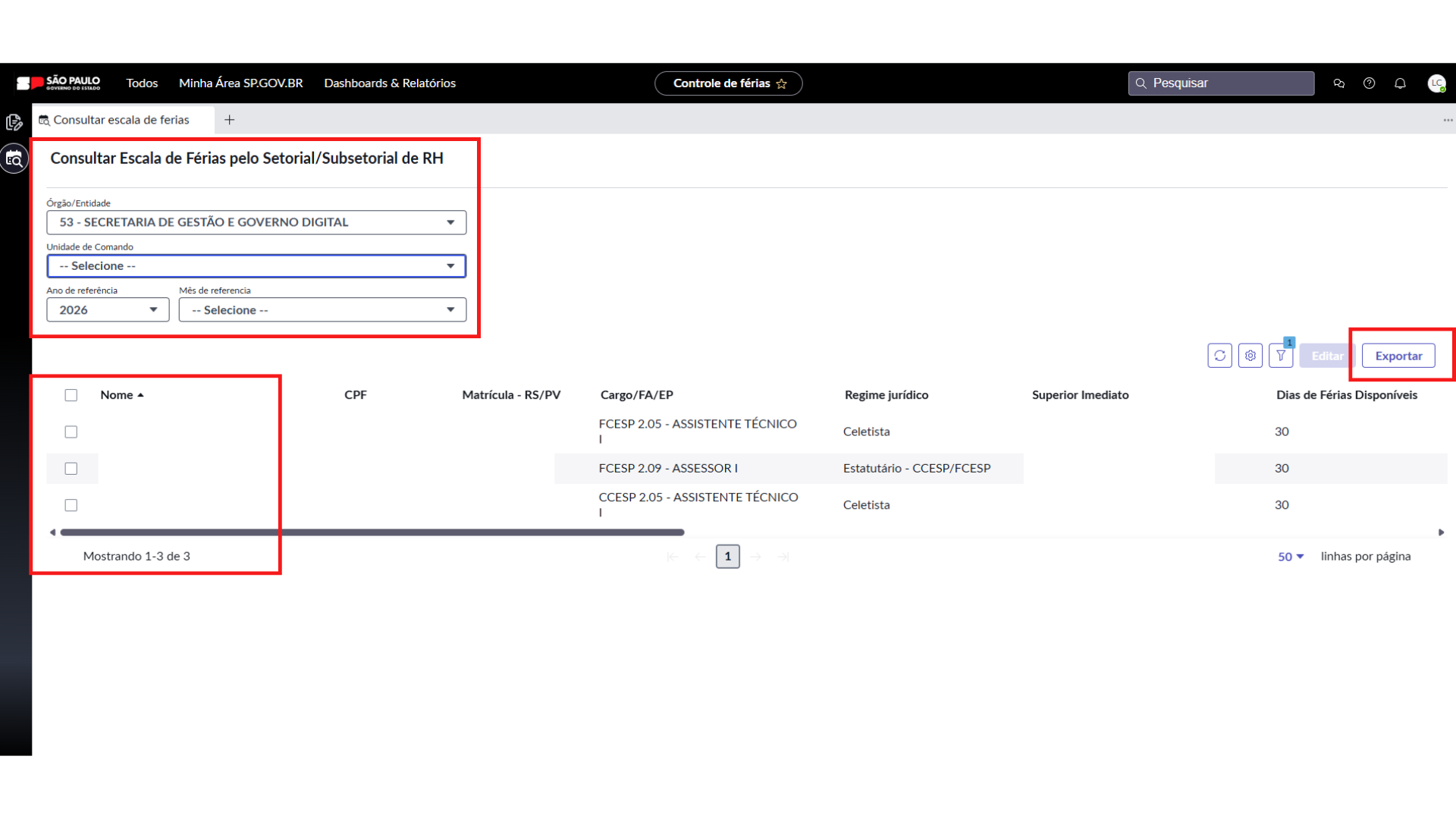 A funcionalidade oferece filtros por unidade administrativa, mês ou ano de referência, além da possibilidade de exportar relatórios em PDF ou Excel para acompanhamento e gestão.