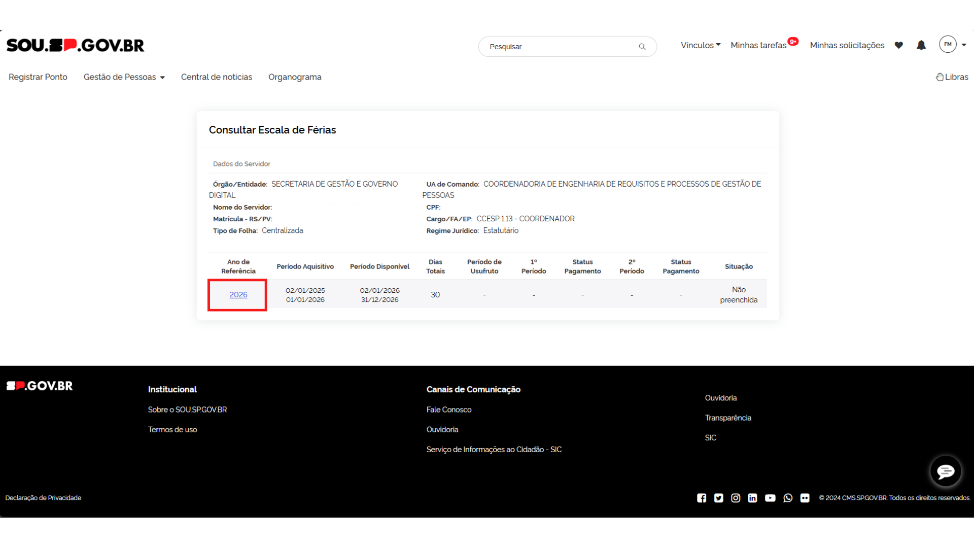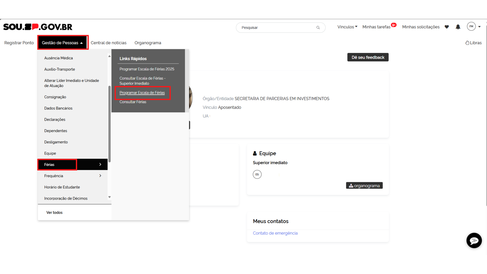 O serviço Programar Escala de Férias – Regime Jurídico Diversos permite que servidores estatutários e de outros regimes jurídicos registrem seus períodos de usufruto de férias diretamente no sistema SOU Gestão de Pessoas.