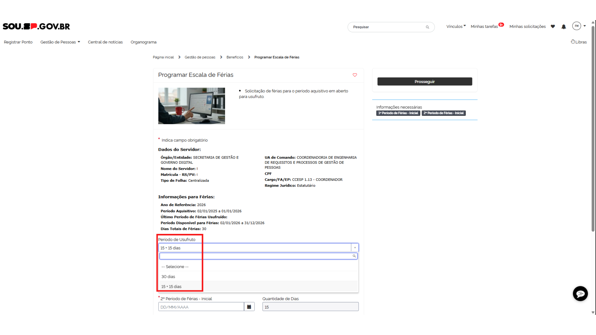 - No campo “Período de Usufruto” selecione entre um período único de “30 dias” ou em dois períodos “15+15 dias”.