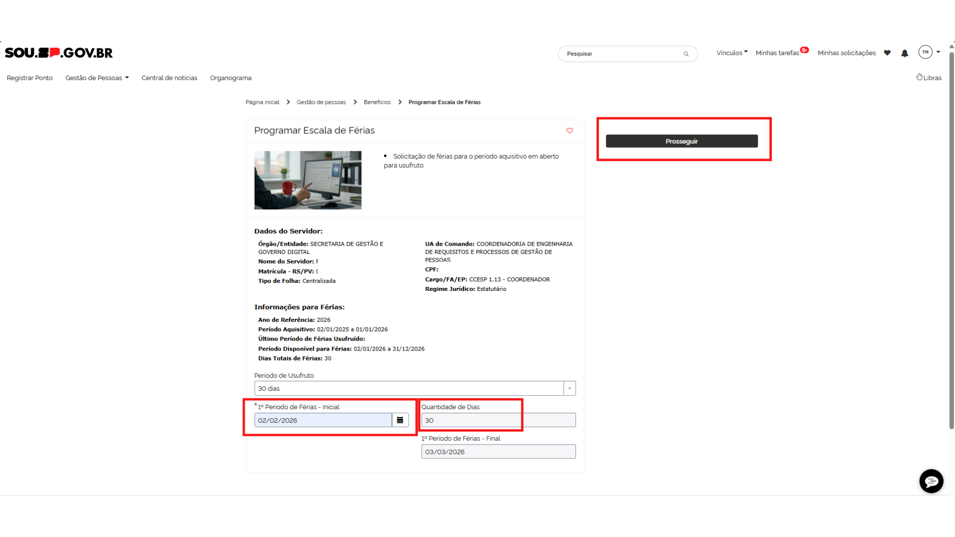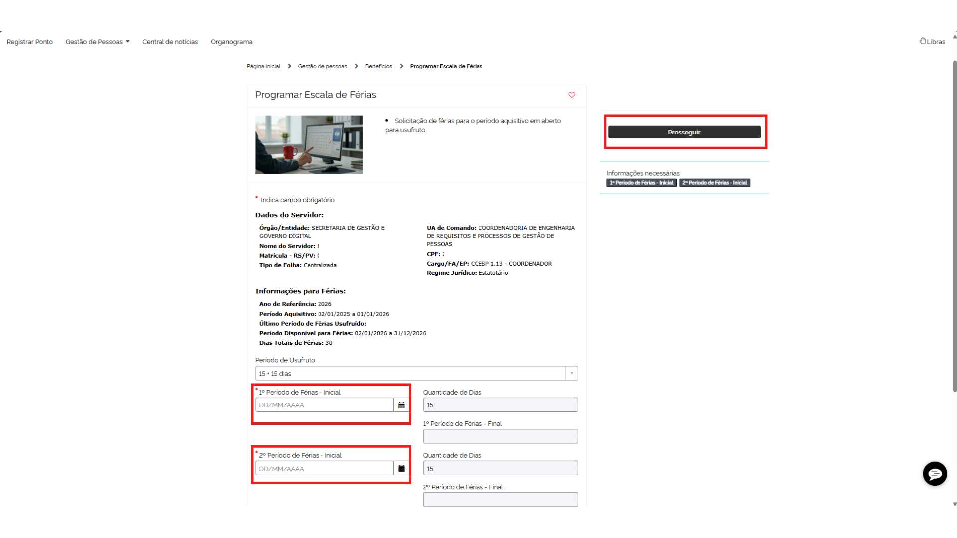 6. Após a seleção do período de usufruto, o sistema apresenta os campos para preenchimento.