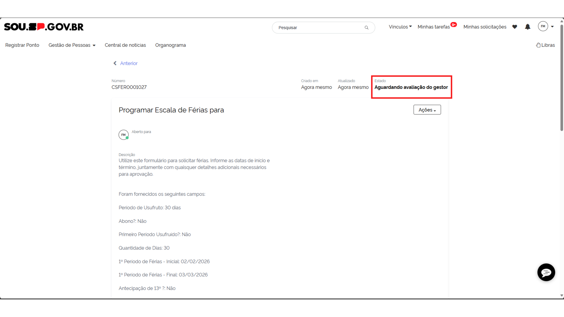 8. Após sua escala de férias estar programada, o sistema apresentará uma tela com detalhamento das informações referentes a escala. E observe que no campo “Estado” apresentará a informação “Aguardando avaliação do Gestor”.