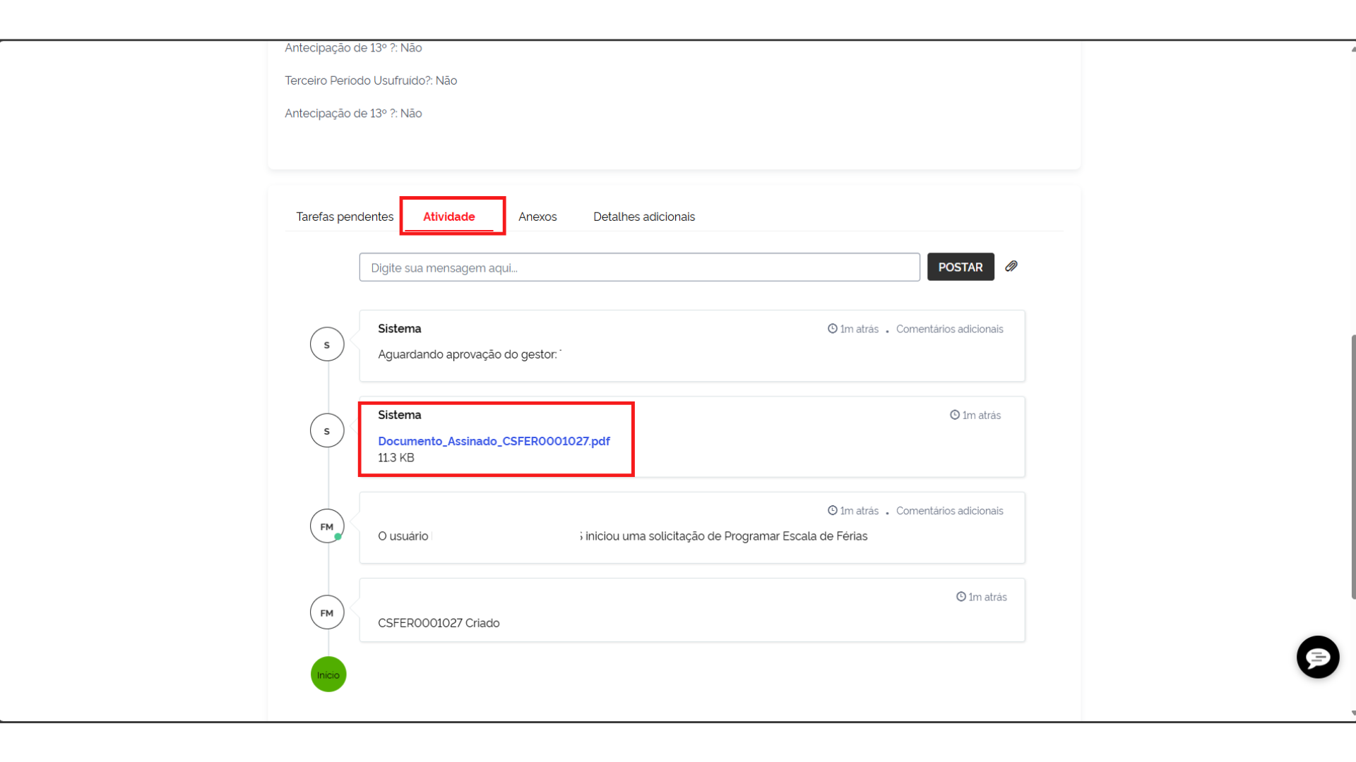 9. Ao final da tela, podem ser observadas as abas “Atividade” que apresentará um resumo das etapas, “Anexo” que apresentará o documento em PDF com a assinatura eletrônica do Servidor e “Detalhes Adicionais” que possui as informações preenchidas na escala de férias. Você deverá aguardar a validação do Superior imediato.