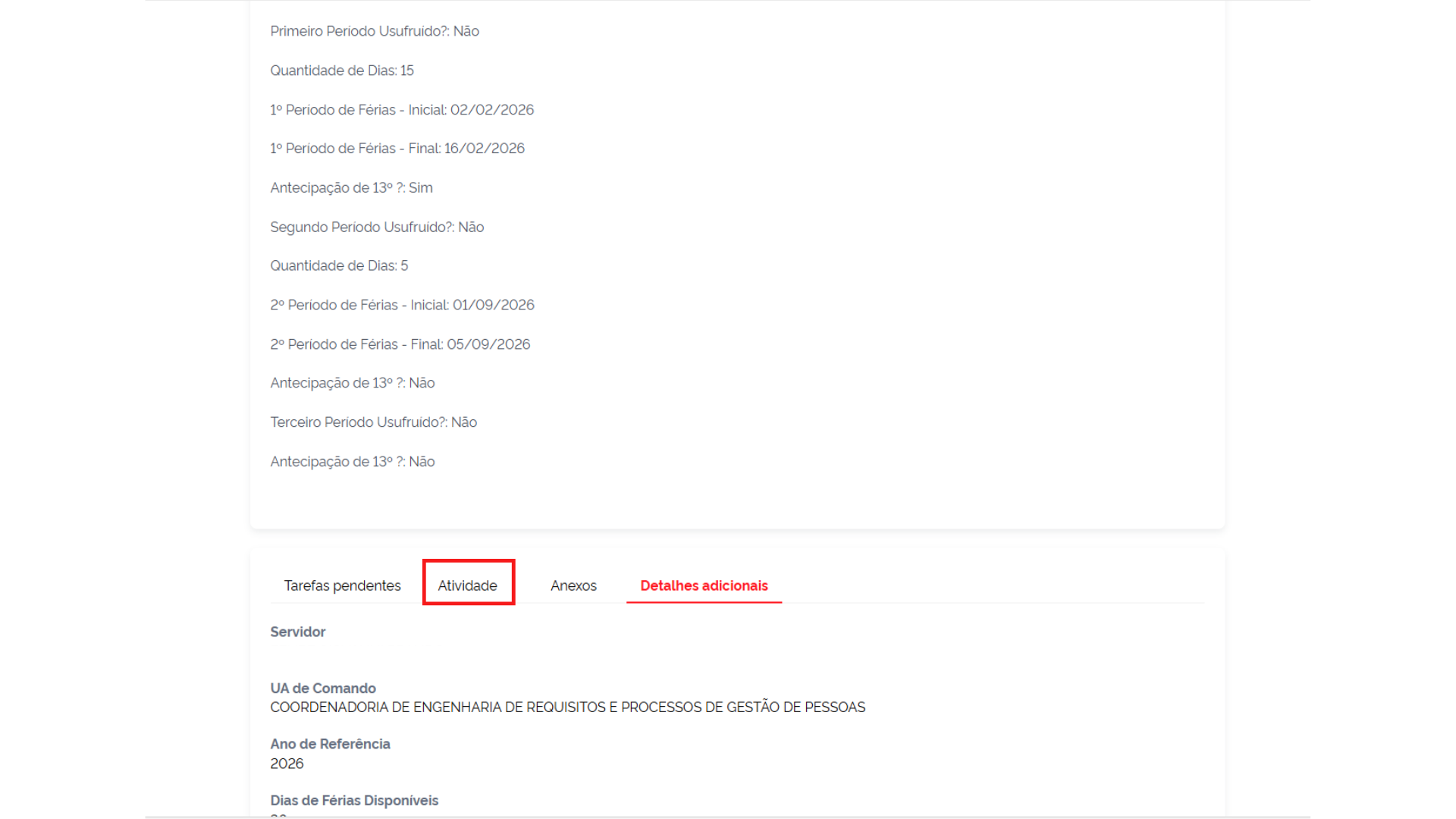 6. Ao final da tela, podem ser observadas as abas “Atividade” que apresentará um resumo das etapas, “Anexo” que apresentará o documento em PDF com a assinatura eletrônica do Servidor e “Detalhes Adicionais” que possui as informações preenchidas na escala de férias.