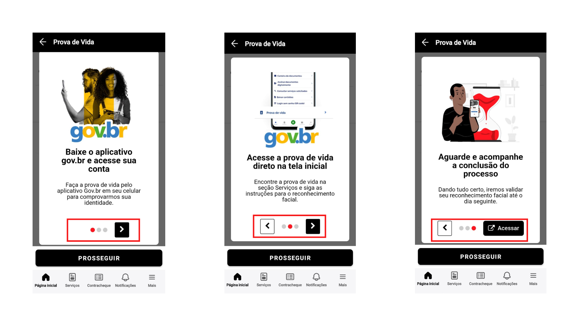 3. Um carrossel de instruções será exibido com orientações sobre como realizar corretamente a Prova de Vida. Leia todas as informações com atenção e clique em “Acessar” para avançar.