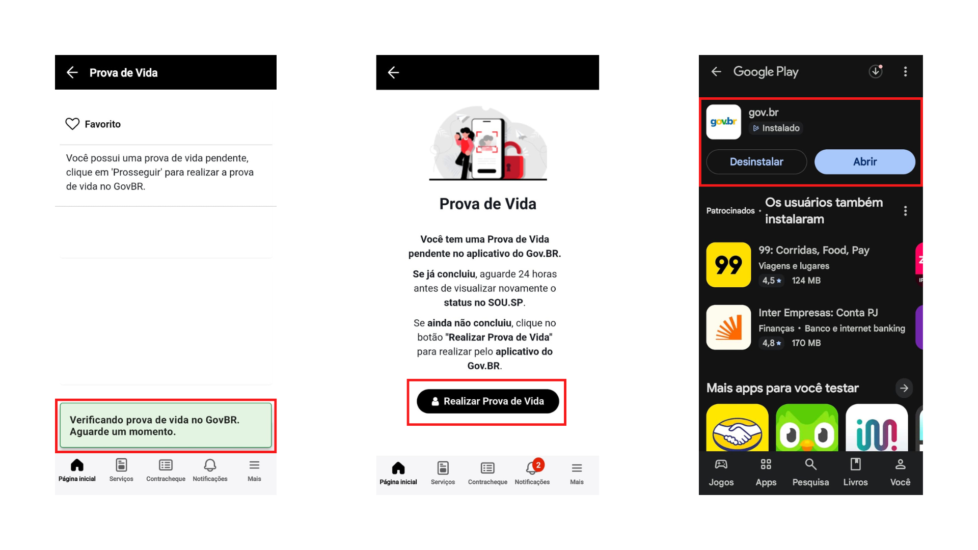 4. O sistema exibirá a mensagem: “Verificando pendência de Prova de Vida no Gov.br.” Em seguida, clique em “Realizar Prova de Vida”. Você será redirecionado para sua loja de aplicativos para instalar ou abrir o app Gov.br.