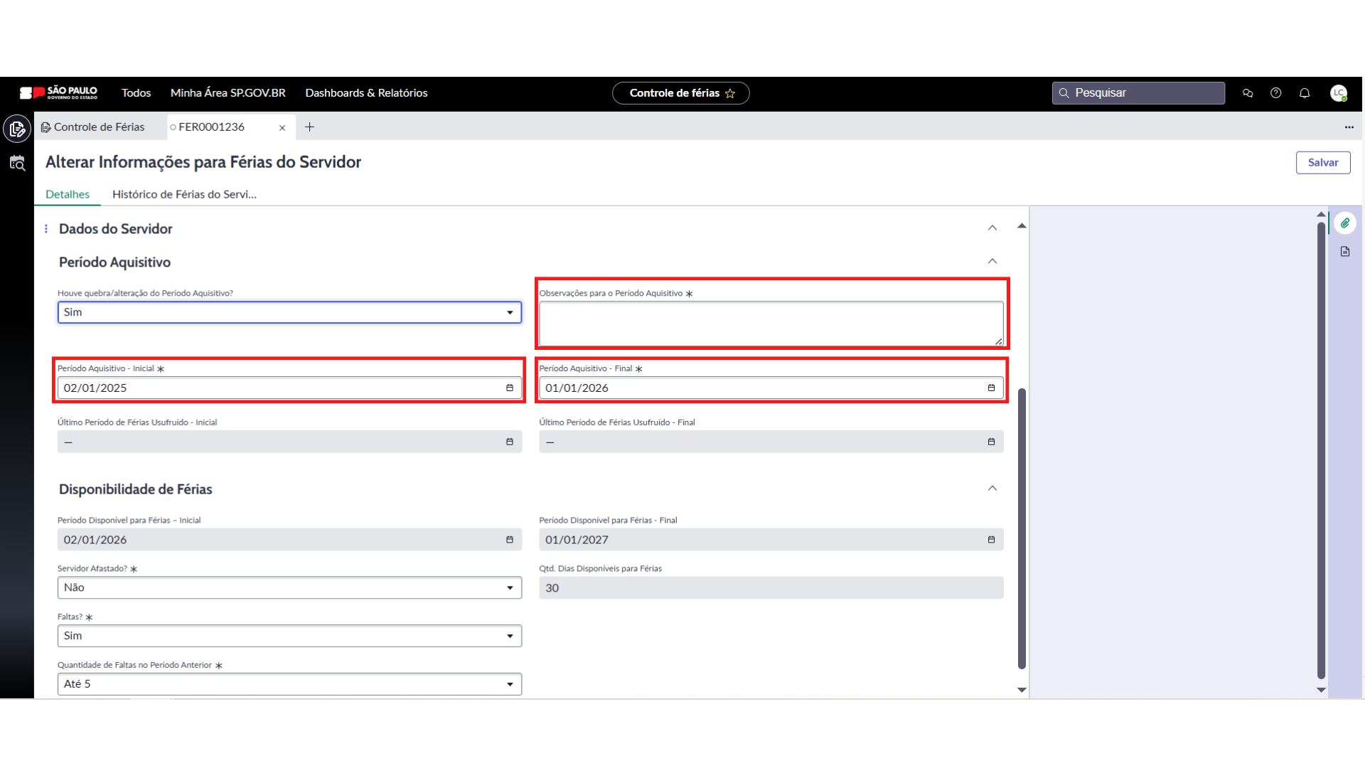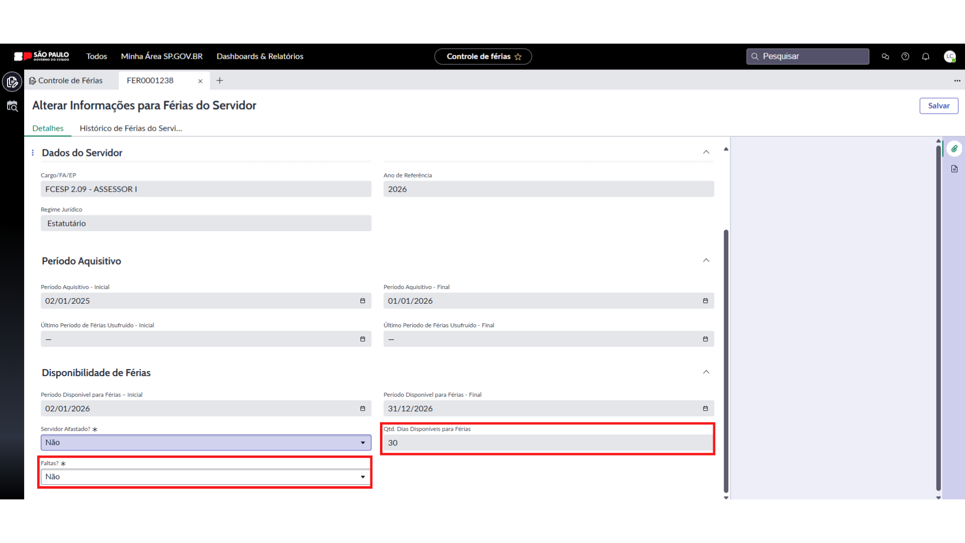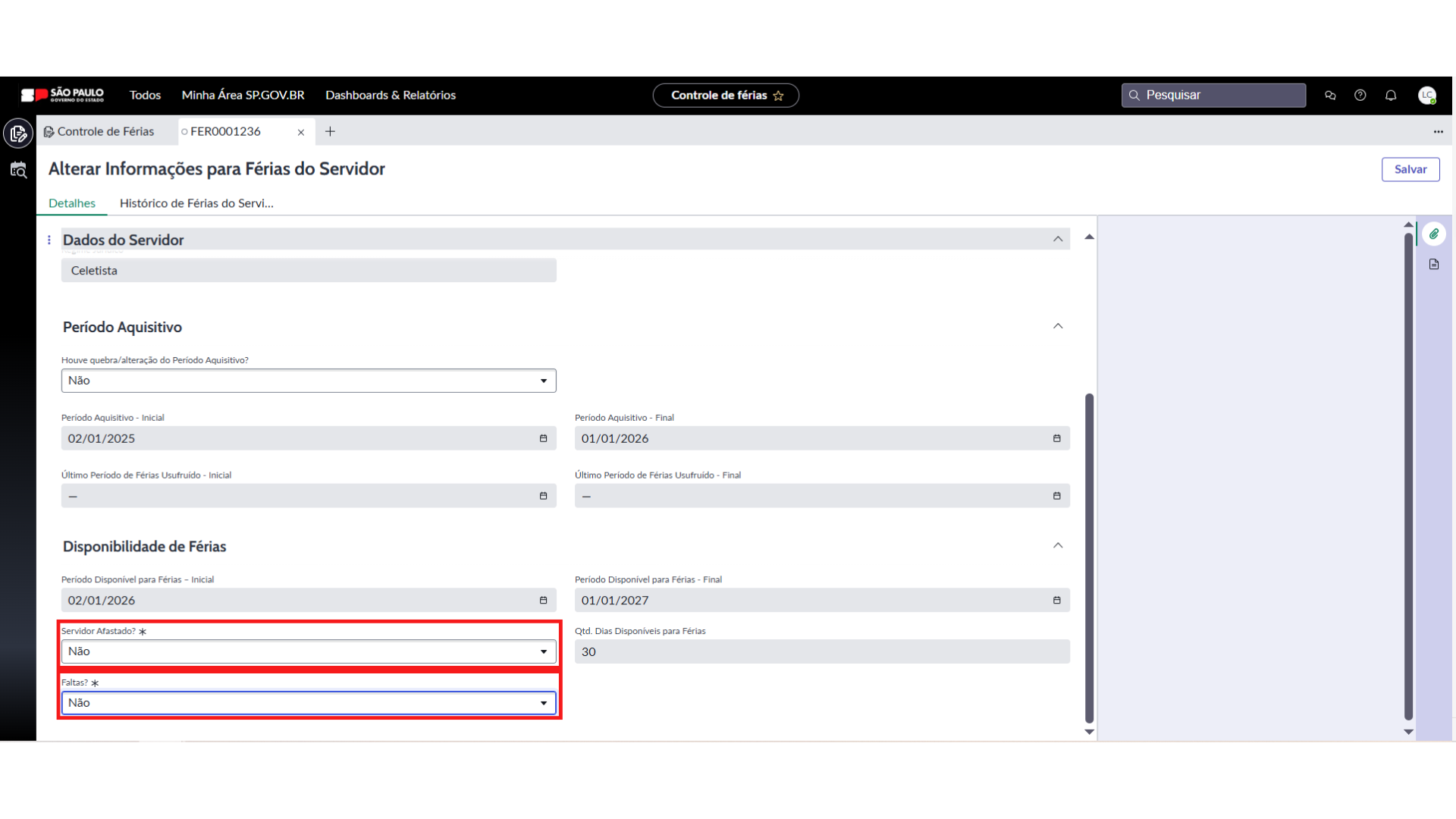 - Não, o sistema preenche automaticamente o campo “Qtd. Dias Disponíveis para Férias”, com a informação “30 dias de Férias”.