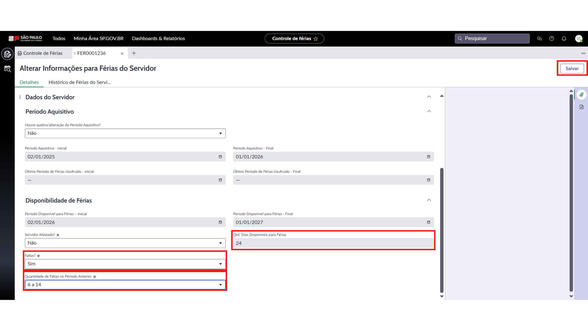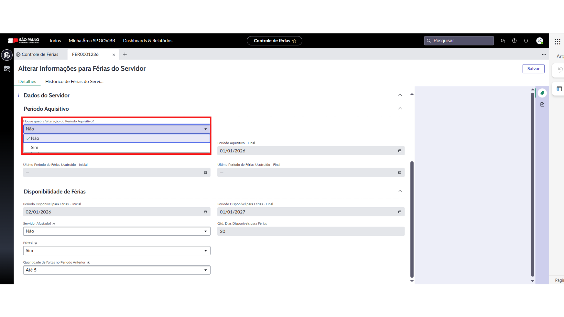 - Sim, habilitará automaticamente o campo “Quantidade de Faltas no Período Anterior”, com as opções de faltas correspondentes ao período anterior para seleção do usuário. Após selecionar a opção correspondente o sistema preenche automaticamente o campo “Qtd. Dias Disponíveis para Férias”.