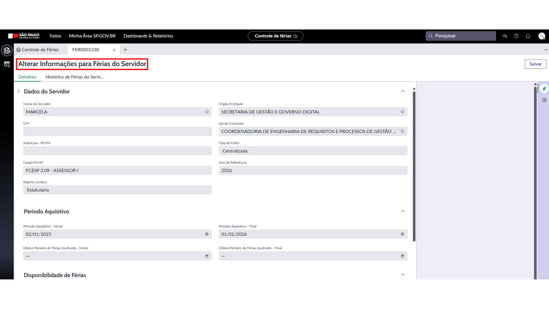 6. O sistema abrirá uma aba “Alterar Informações para Férias do Servidor” com as seguintes seções: “Dados do Servidor”, “Período Aquisitivo” e “Disponibilidade de Férias”. É importante conferir os dados.