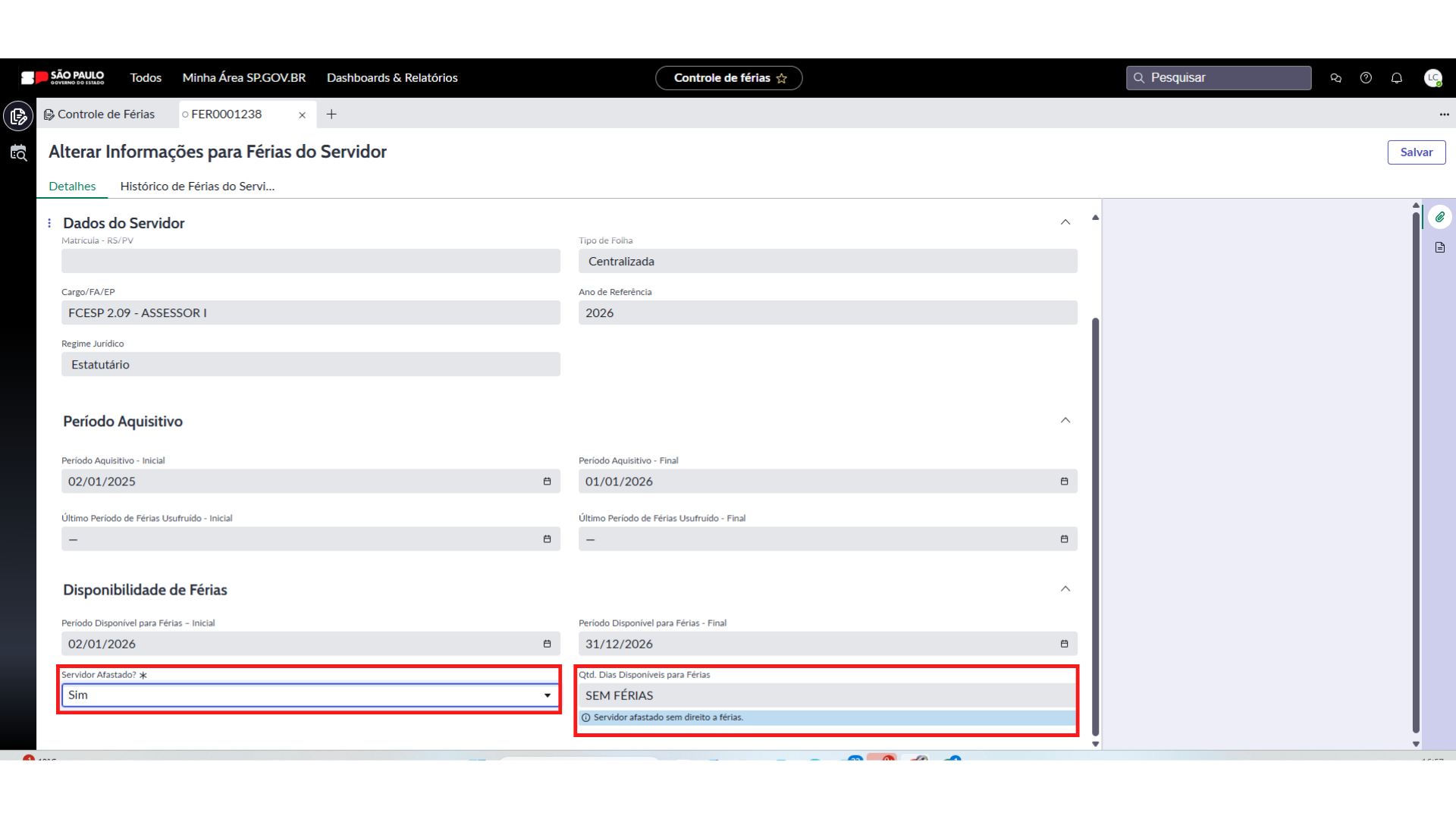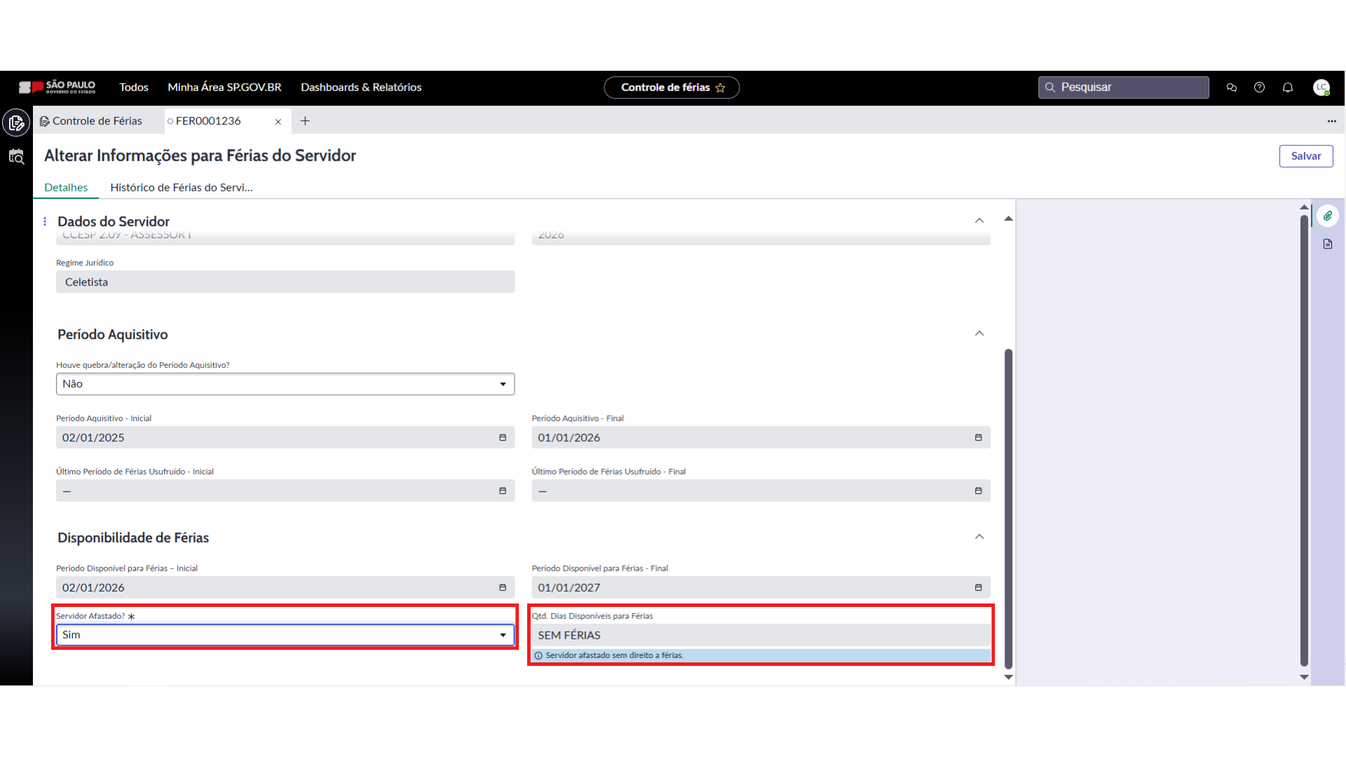 - Se selecionado “sim”, o sistema apresenta no campo a informação: SEM FÉRIAS e a mensagem “Servidor afastado sem direito a férias”.