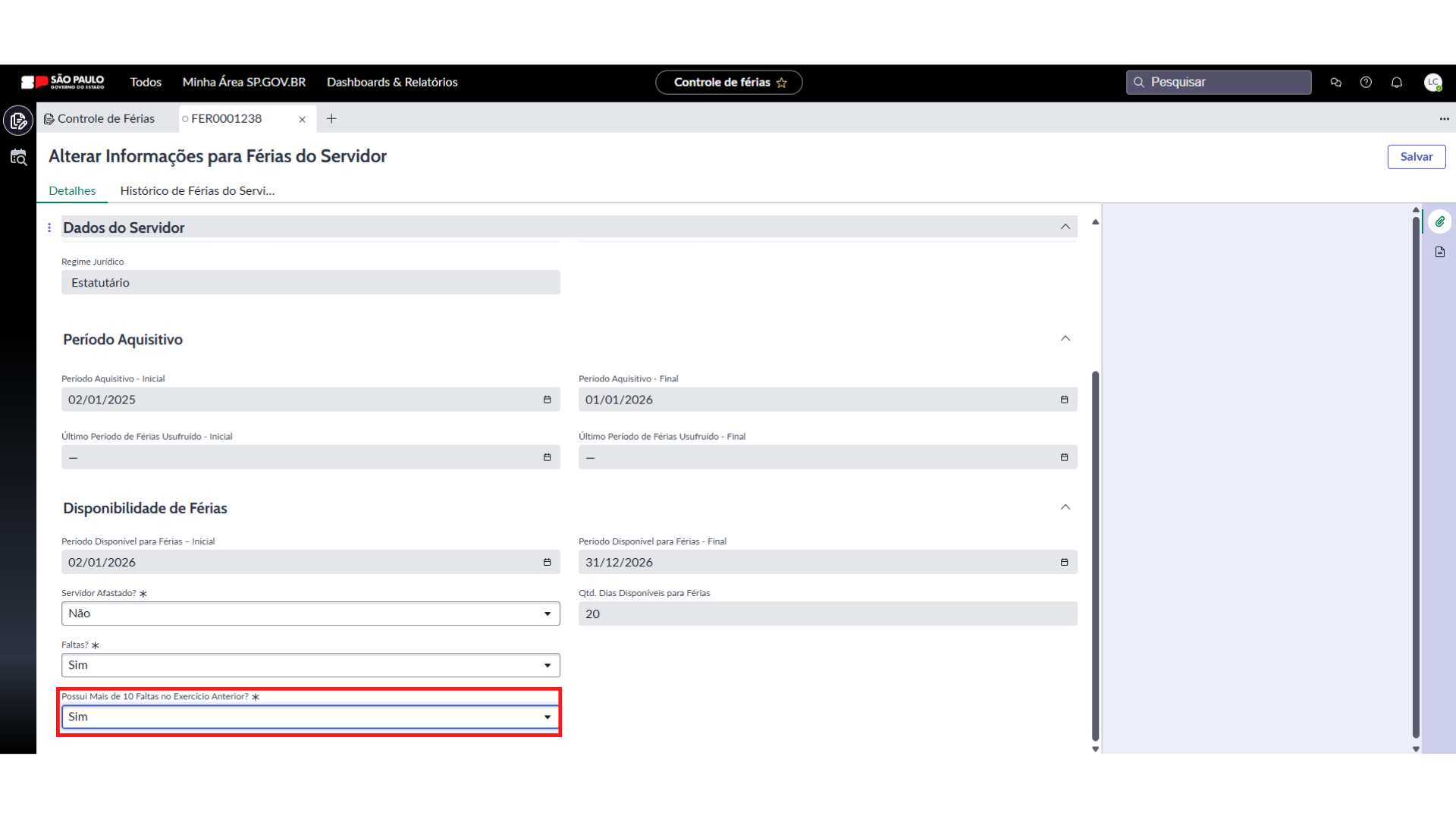 - Sim, habilitará automaticamente o campo “Possui Mais de 10 Faltas no Exercício Anterior, selecionando entre “Sim” ou “Não”.