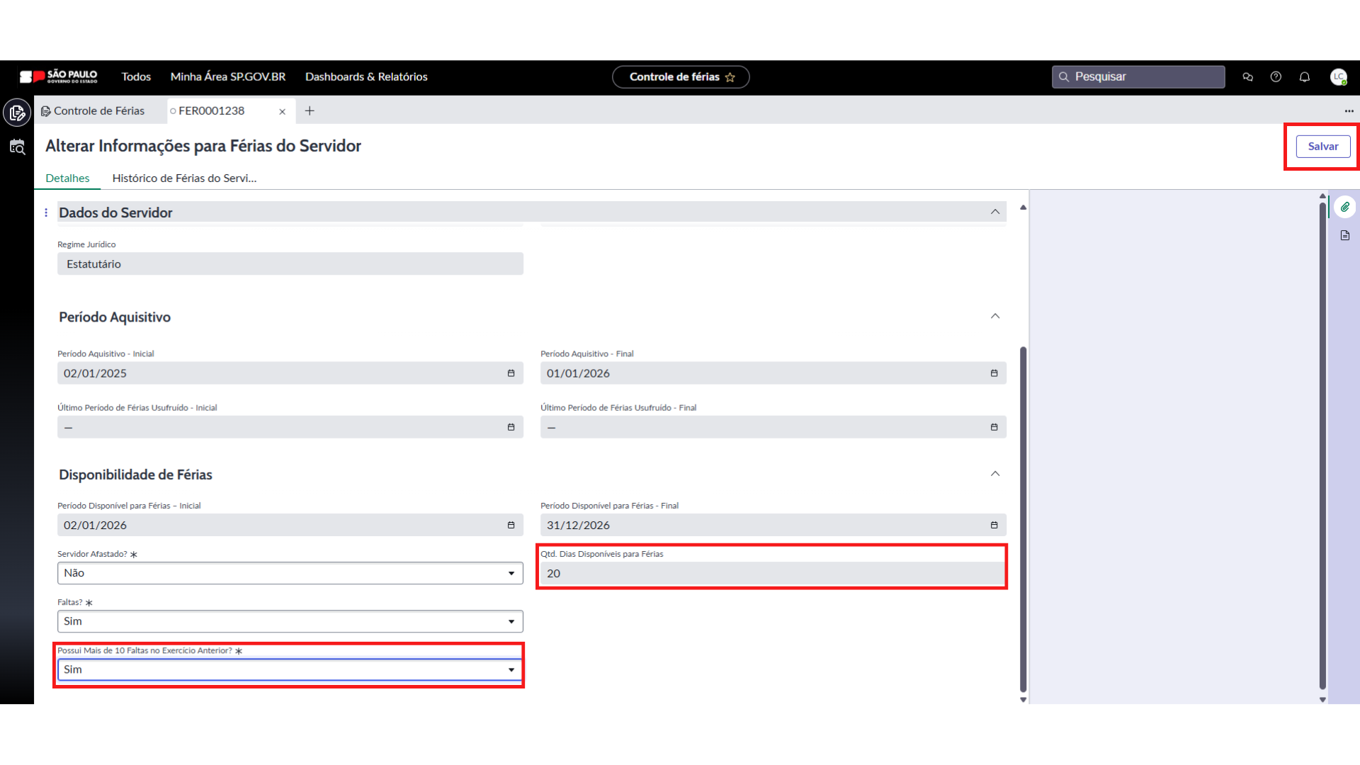- Sim, o sistema preenche automaticamente o campo “Qtd. Dias Disponíveis para Férias”, com a informação “20 dias de Férias”.