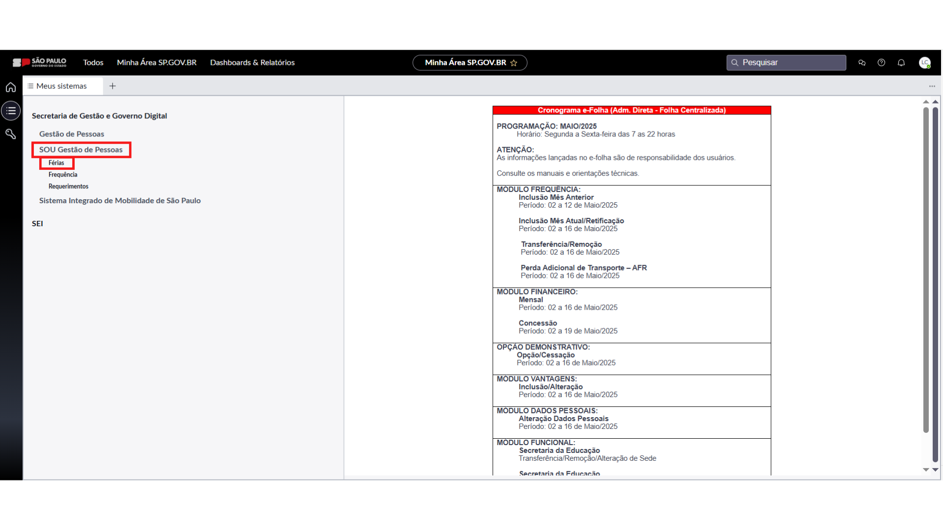 3. Depois deverá clicar em “SOU Gestão de Pessoas”. Vai abrir uma sub-lista e deverá clicar em “Férias”.