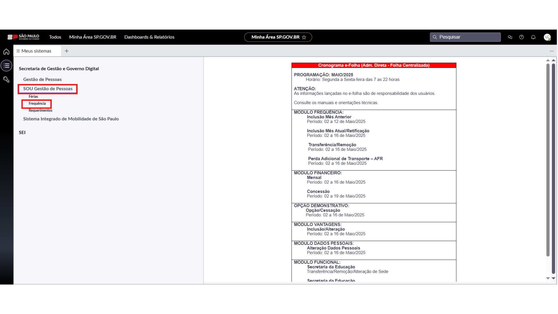 3. Clique em "Meus Sistemas". Após clique em SOU – Gestão de Pessoas – Frequência.