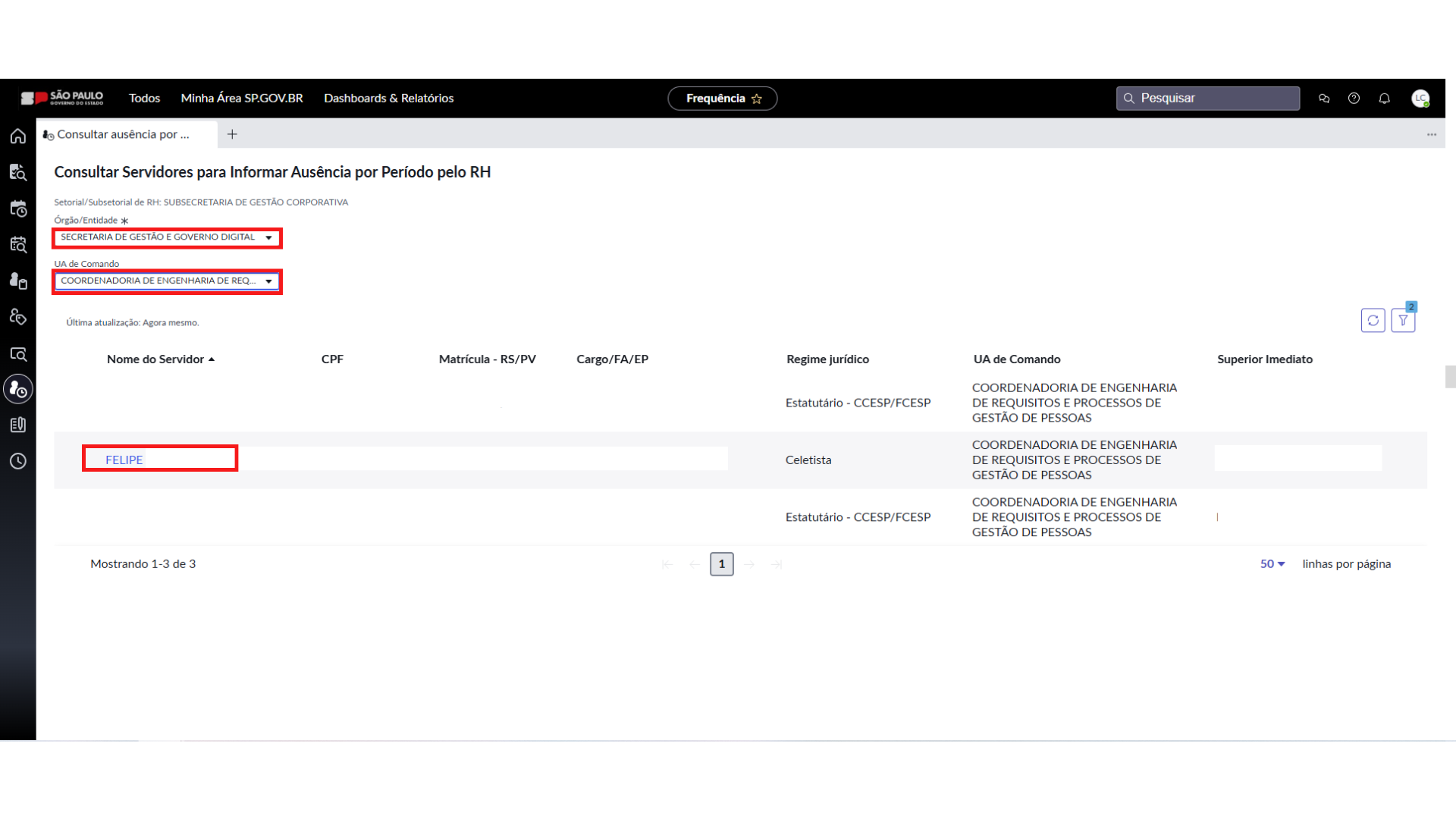 9. Ao retornar para a tela “Consultar Ausência por Período RH” e atualizá-la, passara a constar as informações lançadas para o servidor.