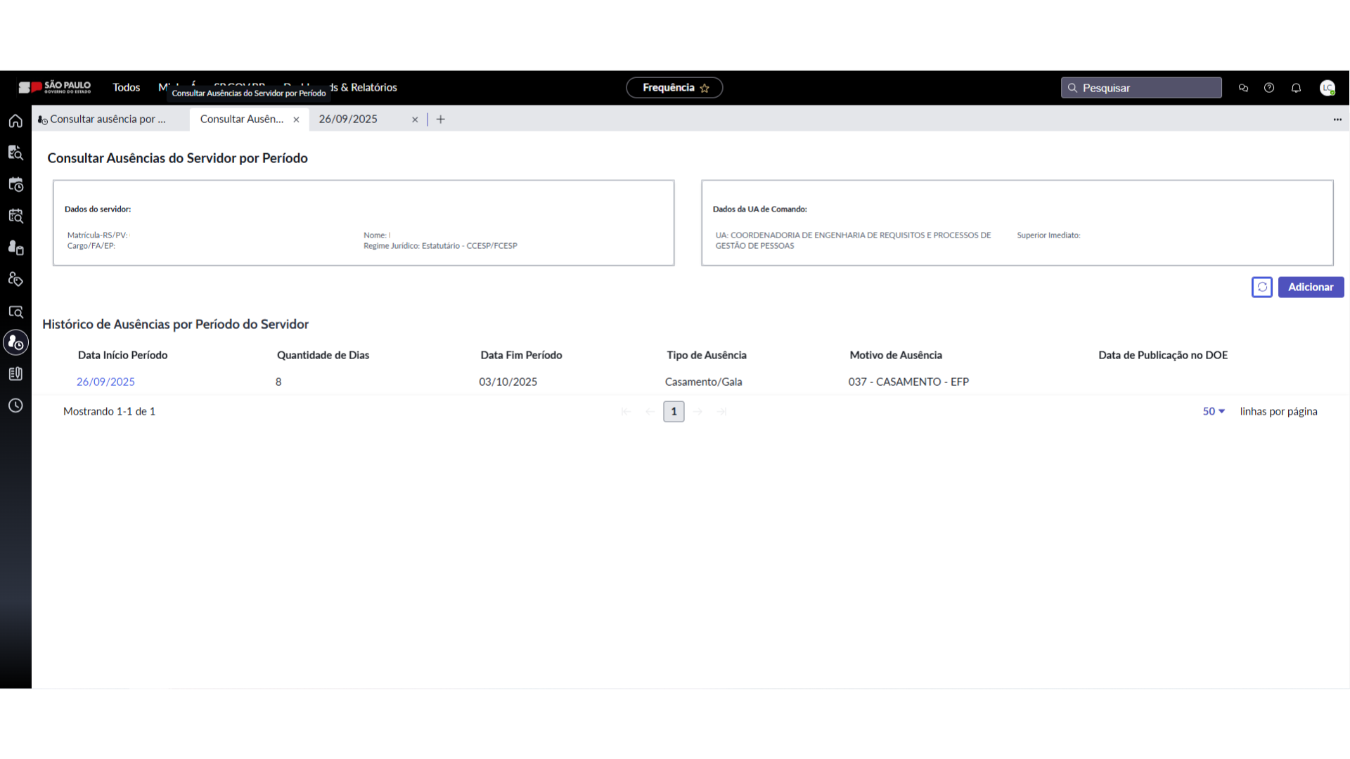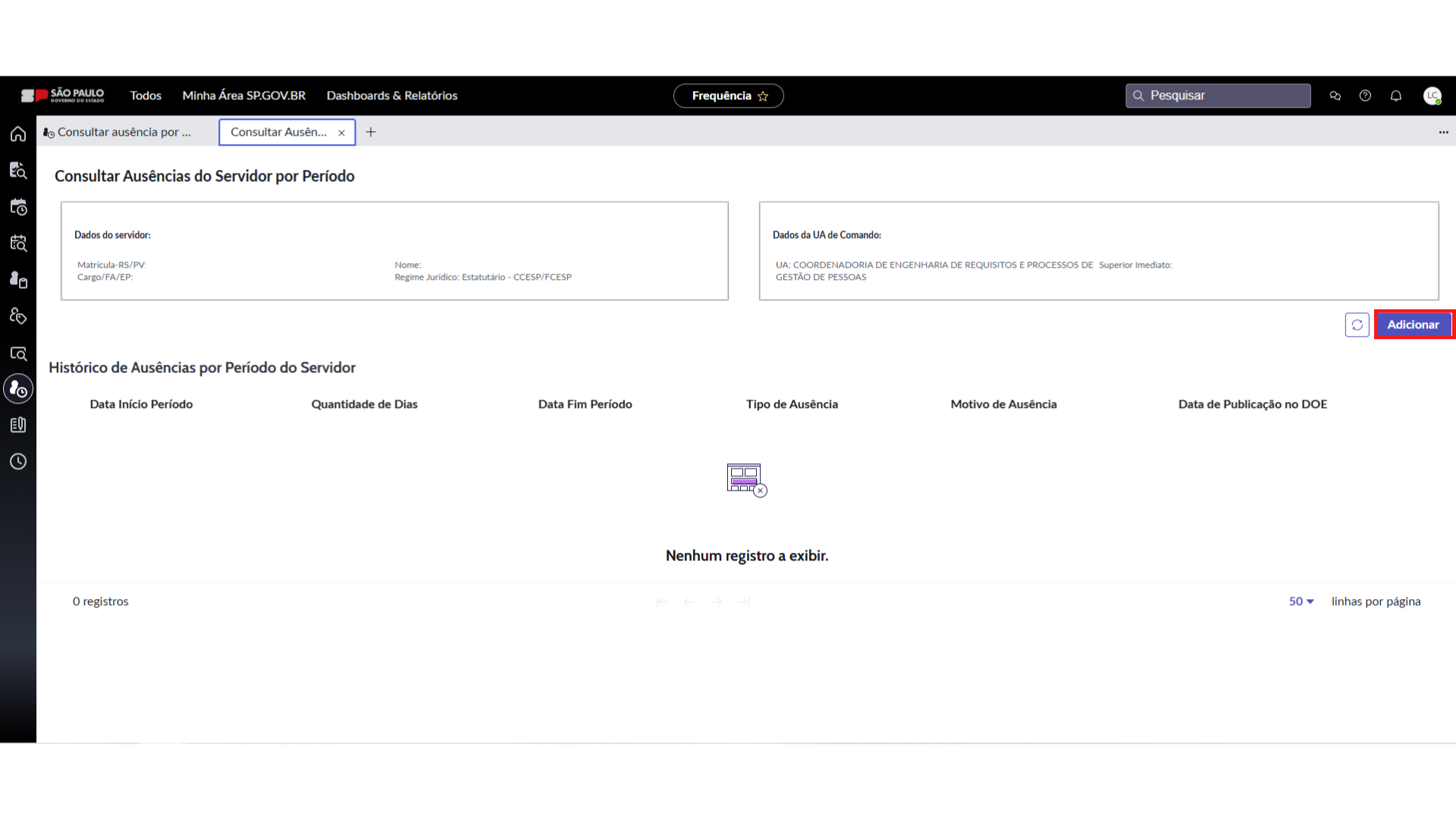 6. O sistema abrirá uma nova tela com os dados do Servidor e deverá clicar no botão “Adicionar” o sistema abrirá outra tela par que os dados da referida ausência sejam informados.