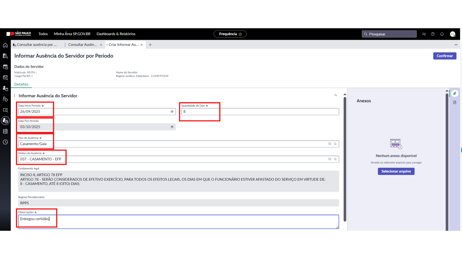 - A seleção do tipo e do motivo da ausência preenche automaticamente o fundamento legal e o regime previdenciário;