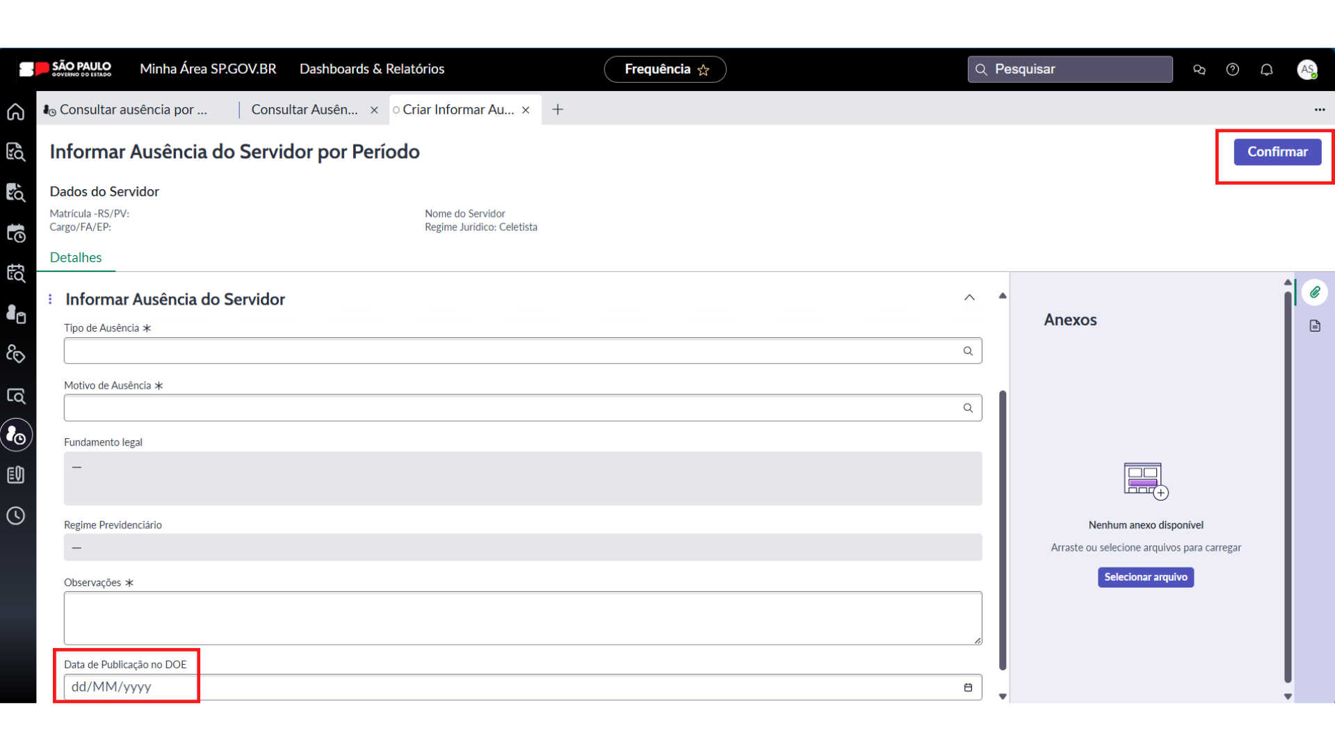 - Em ausências que necessitem de publicação no Diário Oficial, informe a data de publicação antes de concluir o registro.