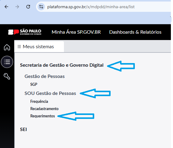 3. Clique em "Secretaria de Gestão e Governo Digital", "SOU Gestão de Pessoas" e "Recadastramento".