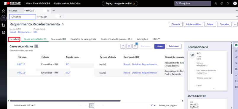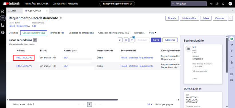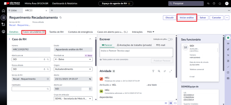 6. Ao abrir o requerimento, clique em “Iniciar a análise” para atribuir a tarefa a você. Depois, clique em “Casos secundários” para conferir as solicitações dos servidores que precisam de análise e comprovação da área de Gestão de Pessoas.