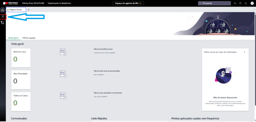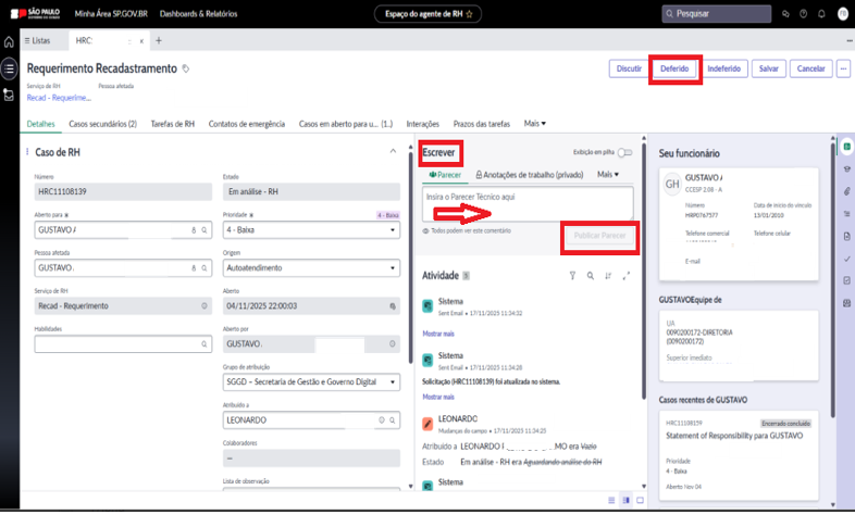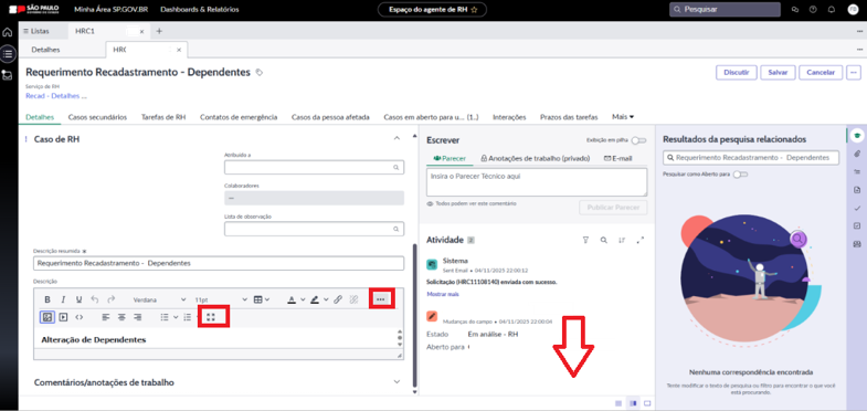 8. Verificar no bloco “Escrever” se houveram documentos anexados pelo servidor, clicar nas 3 linhas no primeiro bloco de "Caso de RH" e depois clicar no expansor de tela para verificar alterações.