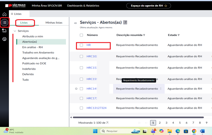 5. Clique em “Listas”, selecione “Abertos” e procure os requerimentos cuja descrição resumida é “Requerimento Recadastramento”.